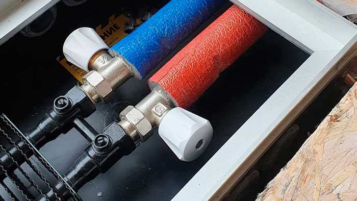Самый простой и распространенный вариант регулировки, это с помощью шаровых кранов. Простое управление, включил/выключил. Так происходит когда сам монтажник принимает решение как установить конвектор не уведомляя клиента, так как такая схема самая легкая. Чтобы управлять вам необходимо будет поднять решетку, и открыть или закрыть шаровый кран. Или тепло или холодно.