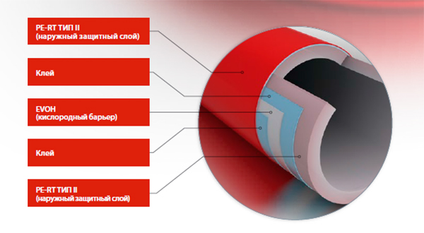 Слой из поливинилэтилена (EVOH) препятствует проникновению кислорода в теплоноситель.