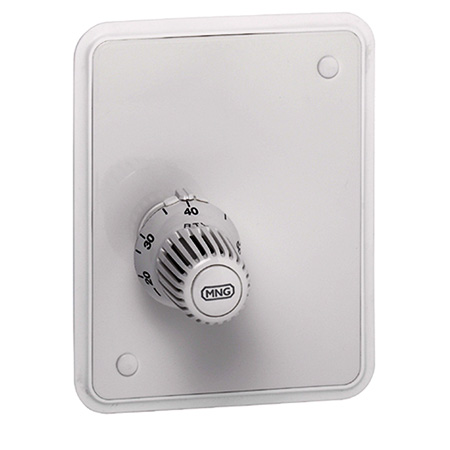 Термостатический комплект рассчитан на эксплуатацию в помещениях площадью до 10 кв. м. Состоит из широкой фронтальной панели, латунного корпуса и выступающей ручки-регулятора.