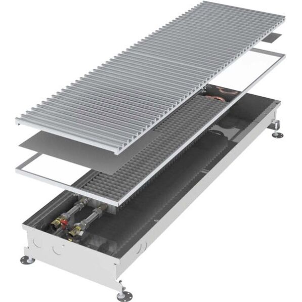 Встраиваемые в пол конвекторы Minib, работающие по принципу естественной конвекции (без вентилятора) используются для обогрева зданий с панорамными окнами, стеклянными витринами и стенами. Рабочий процесс таких устройств несложный – исходящий от стекол прохладный воздух опускается, перемещаясь сквозь теплообменник, нагревается и продвигается вверх, распространяясь по всей комнате. Конструкция приборов состоит из стального корпуса, медно-алюминиевого теплообменника и декоративной решетки, покрывающей механизм. Внутрипольные агрегаты Minib характеризуются прочностью, высокой теплоотдачей и экономностью.