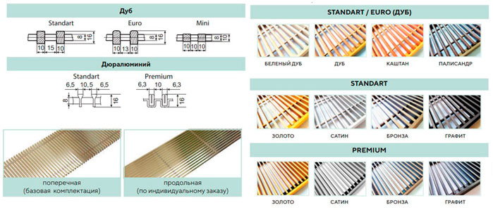 Конвекторы дополнительно комплектуются декоративной решеткой из алюминия или дерева. Алюминий имеет три варианта исполнения: