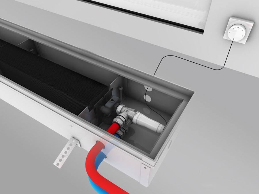 Внутрішньопідлогові конвектори для опалення без тангенціального вентилятора для підвищення зручності керування, доповнюються сервоприводом та термостатом. Наявність даної системи автоматичного регулювання внутрішньопідлогового конвектора з природною конвекцією дає можливість встановлення необхідного температурного режиму на термостаті, який повинен бути в одному приміщенні з конвектором. При видимих температурних коливаннях термостат подає команду сервоприводу, що встановлений на вхідному вентилі обігрівача. Робота сервоприводу полягає в автоматичному регулюванні швидкості потоку теплоносія в конвекторі. Необхідно визначитися з оптимальною температурою в приміщенні, встановити режим, який буде підтримуватися опалювальною системою в автоматичному режимі. Сервопривід для опалення встановлюється в коробі конвектора на термостатичний клапан.
