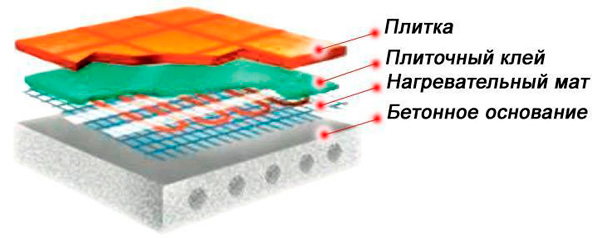 Складаються з кабелів, запроваджених в армовану сітку. Товщина матеріалу трохи більше 3 мм, тому мат практично впливає збільшення висоти підлоги. Варіант є оптимальним для приміщень, де вже є основа з бетону. Нагрівальні мати розтягують по поверхні підлоги, покривають спеціальним клеєм, що фіксує керамічну плиту.