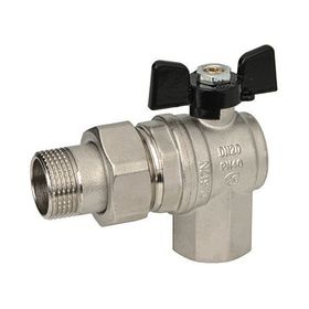 Кульовий кран з американкою Bugatti 594 Oregon кутовий, повнопрохідний, ручка "метеликом", італійського виробництва запірна арматура.