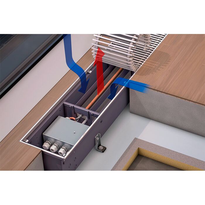 Kampmann Katherm NE – внутрішньопідлогові конвектори електричного типу, що працюють за принципом природної конвекції. Конструкція приладів складається із сталевого оцинкованого корпусу та нагрівальної деталі з нержавіючої сталі. У бічній частині прикріплені стійкі до навантажень монтажні ніжки з висотою, що регулюється. Вироби обладнані вмонтованим захисним термостатом, запобіжником із тепловим реле, а також системою регулювання потужності. Встановлюються як автономне або додаткове джерело тепла. Головними перевагами внутрішньопідлогових пристроїв є безшумність, відмінна тепловіддача, легка і прихована установка.
