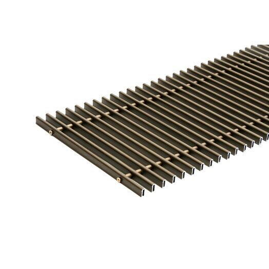 Решітки для внутрішньопідлогових конвекторів KERMI призначені для того, щоб ідеально приховати всю арматуру системи опалення. Ґрати розміщуються в коробі на гумових упорах, які знизу заглушають ударний шум. Складається вона зі стабільних, надійних профільних прутків наступних розмірів: для алюмінієвих поздовжніх і згортаних решіток - 6 мм; для ґрат з нержавіючої сталі - 10 мм; для дерев'яних – 12 мм. Відстань між прутками для всіх типів решітки складає 16 мм, крім поздовжніх, для них відстань становить - 10 мм. Загальна висота решітки – 20 мм. Ви можете вибрати грати з того матеріалу, який якнайкраще буде поєднуватися з вашим покриттям для підлоги. Виробник KERMI пропонує грати на конвектори з таких матеріалів: з дерева (бук, дуб, ясен), дюралюмінію (алюміній), нержавіючої сталі. Алюмінієві грати мають чотири базові кольори: сатин, латунь, бронза, темне срібло та чорний (фарбування виробляється методом порошкового напилення кольоровими відтінками RAL). Решітки KERMI є двох типів: поздовжня і згортається. Поздовжні решітки виготовляються з алюмінієвого профілю, поздовжні прутки кріпляться нерухомо за допомогою опресовування на алюмінієвий куточок з відстанню 200-300 мм.