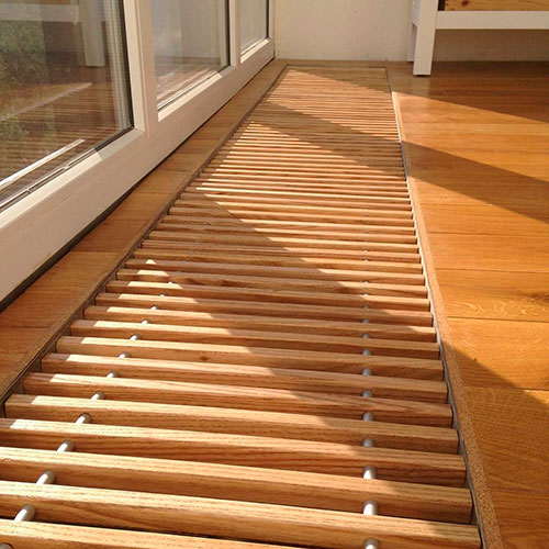 Декоративна решітка Polvax для внутрішньопідлогових конвекторів – єдиний видимий елемент конвектора, що характеризується міцністю, який, крім естетичної функції, гарантує захист вбудованого в підлогу конвектора від механічних пошкоджень. Всі вироби випускаються рулонного типу (з поперечними ламелями), що зручно під час транспортування та експлуатації. Матеріалом виготовлення решіток виступає високонадійний анодований алюміній чи натуральне дерево.