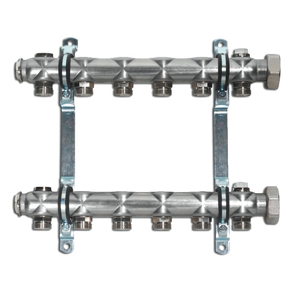 Розподільник для системи опалення (під променеву розведення) FA без витратомірів - виготовлений з високолегованої сталі - спеціального профілю V2A з накидною гайкою (приєднання з плоским ущільненням), складається з: