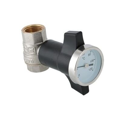 (VT.808.N) Термометр, вбудований у рукоятку управління кульового крана VALTEC BASE VT.808, забезпечує візуальний контроль температури робочого середовища в теплових пунктах, вузлах введення гарячої води, трубопроводах обв'язування бойлера та інших точках інженерних систем. Термометр з'єднаний з кульовим затвором з гільзою мідного сплаву, що дозволяє вимірювати температуру з мінімальною похибкою. При необхідності прилад легко виймається з ручки, а його гніздо закривається заглушкою з ABS-пластику. З цього матеріалу виконана і сама рукоятка крана. Діаметр шкали термометра – 42 мм, діапазон вимірів – 0–120 °С. Різьблення приєднання кульового крана з термометром VT.808 – внутрішнє.